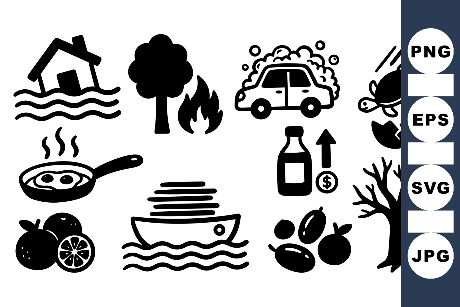 Silhouetted vector icons illustrate hazards like flooding homes, wildfires, animal impacts, daily objects including frying eggs and fruit slices in a simple monochrome style.
