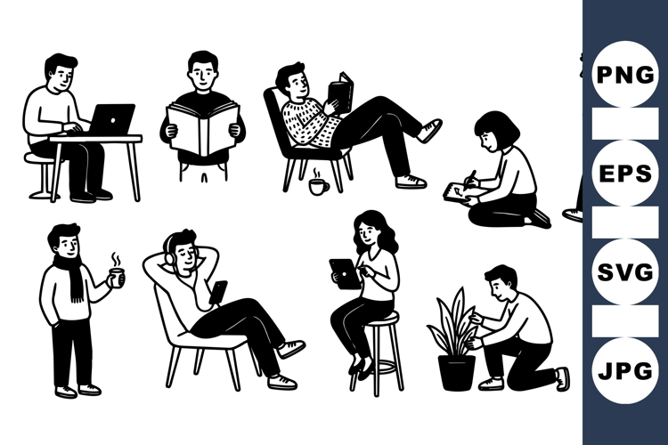 Monochrome vector illustrating a variety of people engaged in activities like reading, typing, and relaxing, captured in casual daily life scenes with clean line art style.