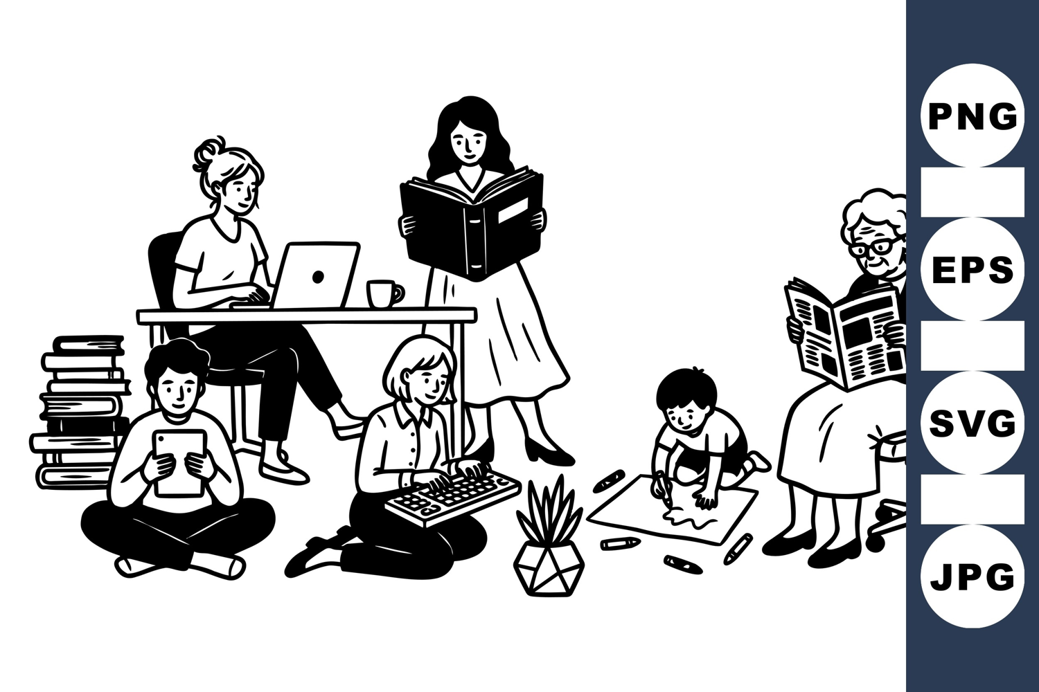 Educational Svg Black And White Drawing Line Art Family Digital Learning Graphics Family Reading Clipart Multigenerational Svg Home Study Clipart Modern Family Illustration Indoor Activity Svg Creative Family Design