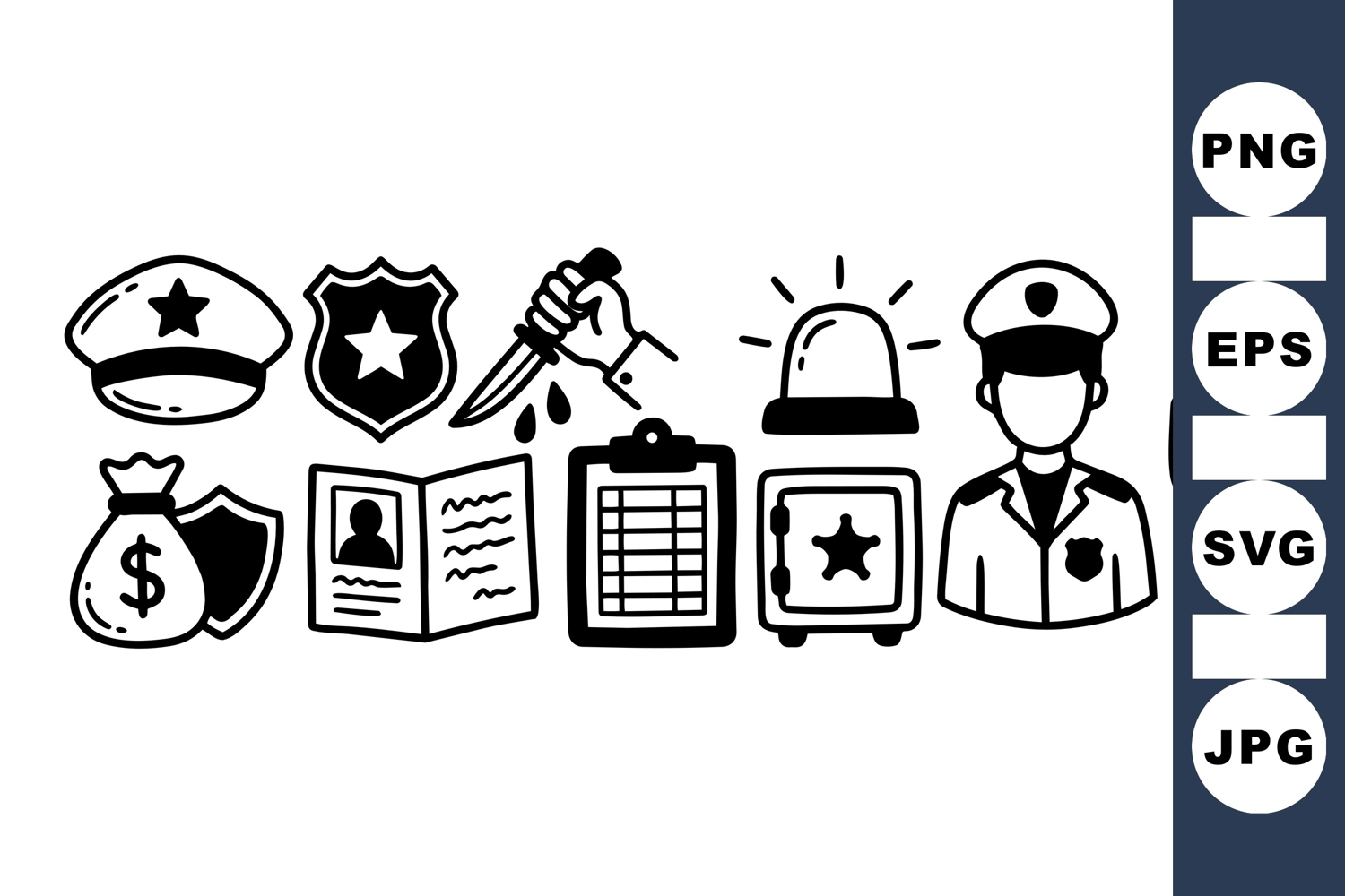 A collection of hand drawn black and white vector icons includes police cap, badge, knife with drops, money bag, id card, clipboard, safe, officer, and radio, with simple line art and bold outlines for law enforcement depiction, minimalistic design.