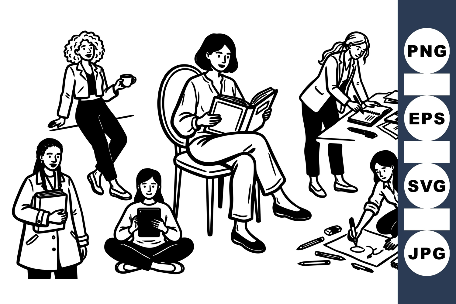 Black and white vector line art shows diverse women engaged in reading, drawing, working at desk with laptop, and relaxing cross legged holding tablet, peaceful mood.