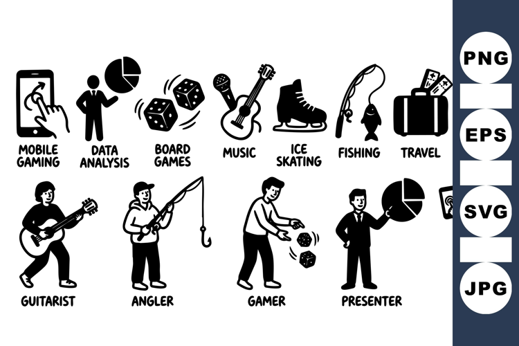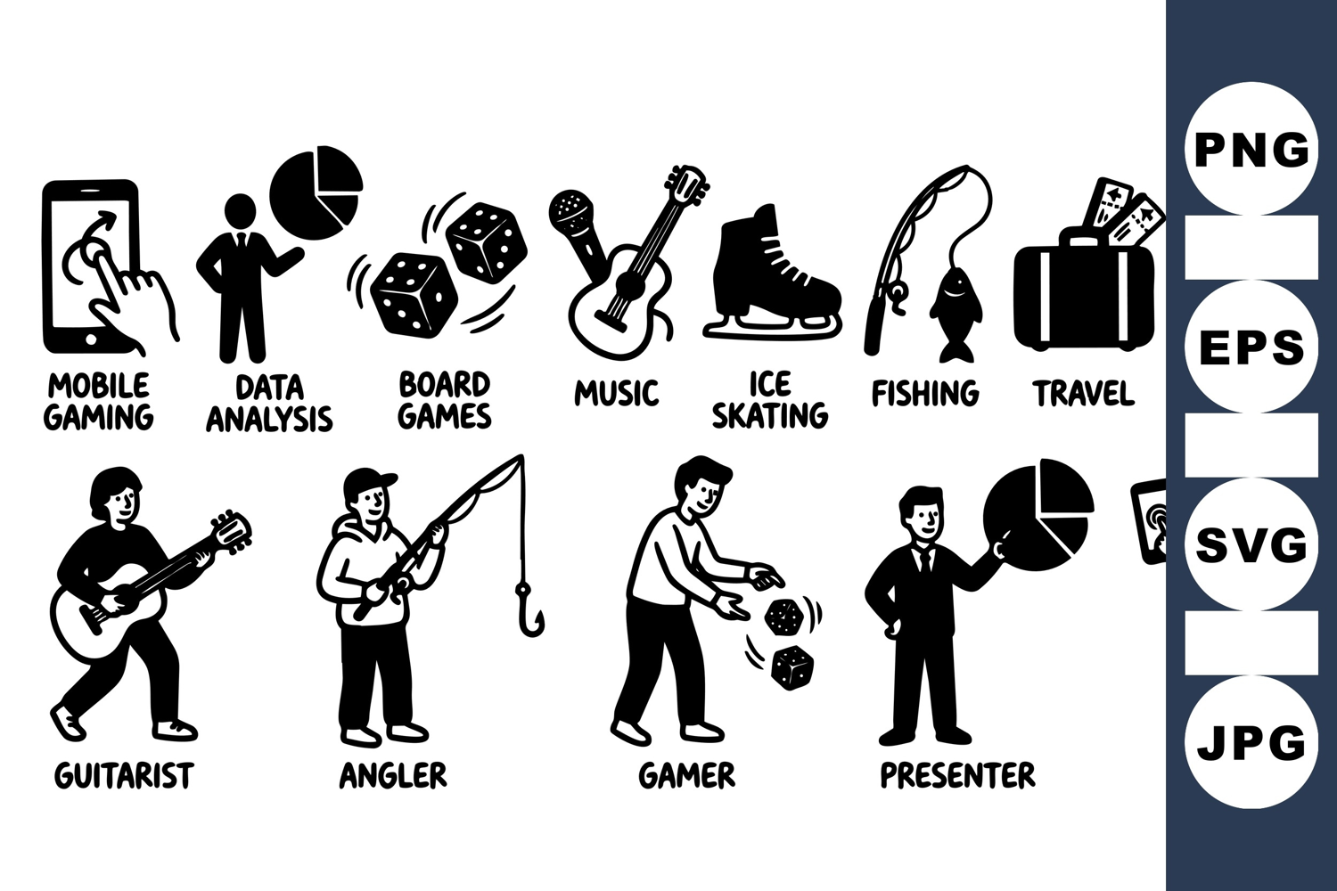 Black and white flat design icons show various actions like playing guitar, fishing, ice skating, gaming, presenting data, and traveling with simple bold lines.
