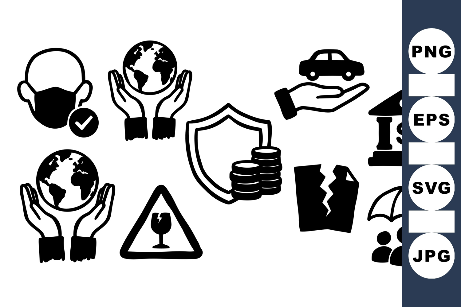 A bold black and white collection of flat insurance and protection icons, including health safety, car, earth, and family coverage, in minimalistic style.