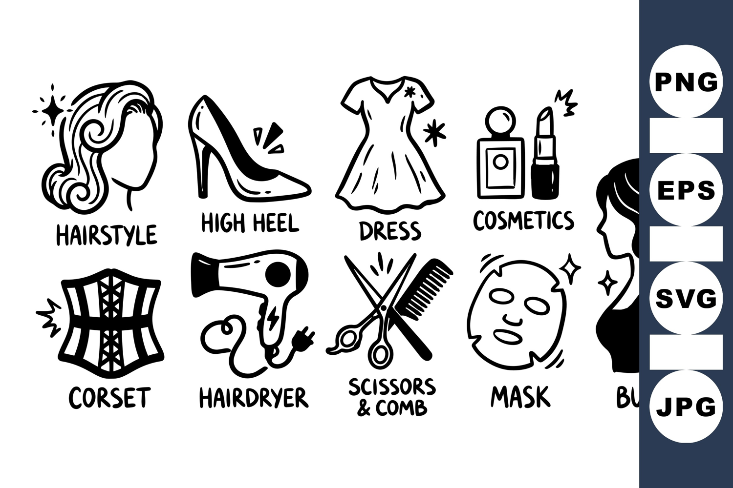 Vector Clipart Hairstyle Design Beauty Fashion Icons Cosmetics Illustration Pack High Heel Shoe Clipart Dress Silhouette Vectors Hairdryer Grooming Kit Scissors And Comb Facial Mask Vector Art Cor Bust Graphics