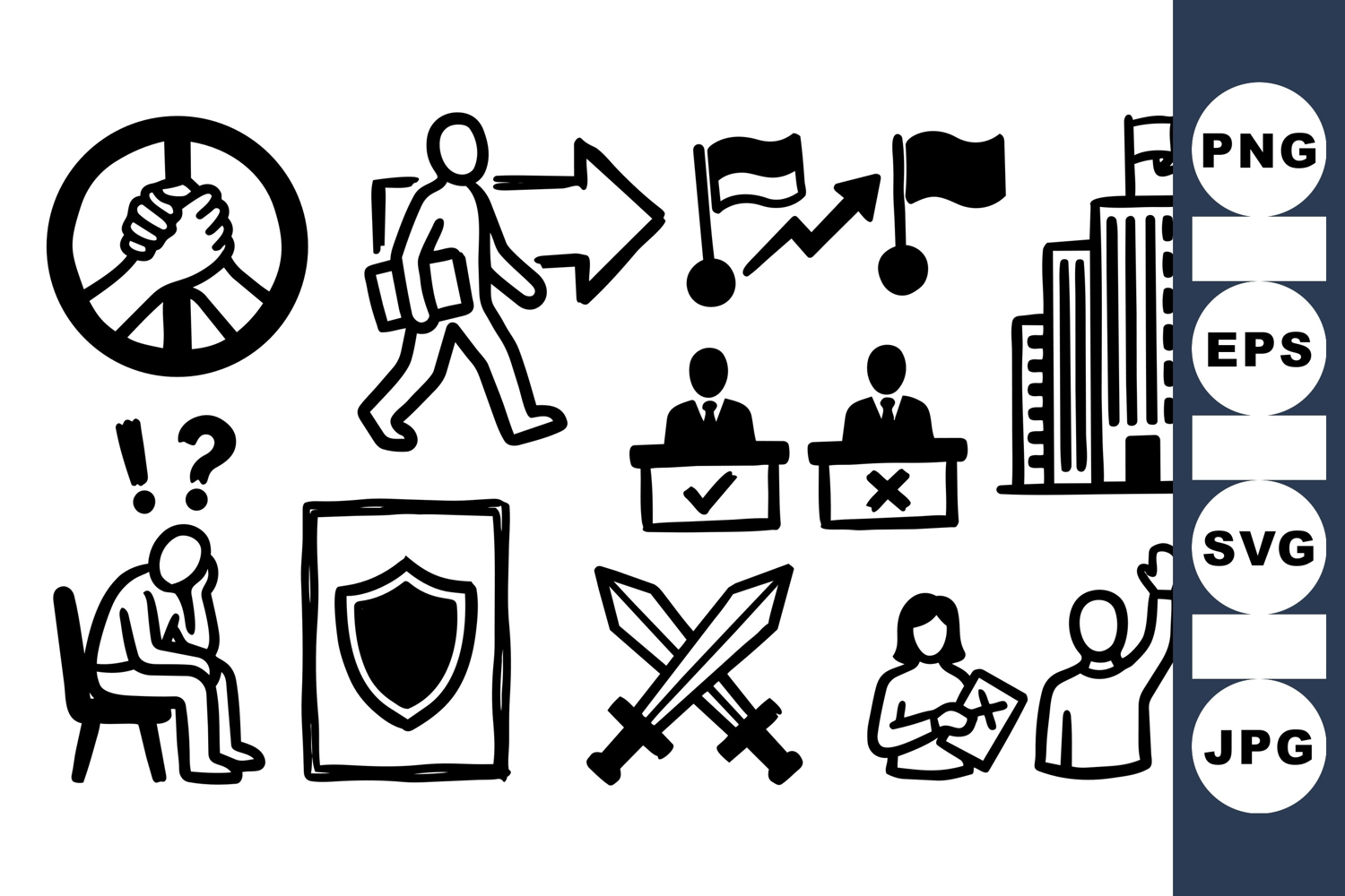 A collection of hand drawn political themed icons in black and white featuring voting, peace, leadership, conflict, protection, and decision making symbols with a simple casual style.