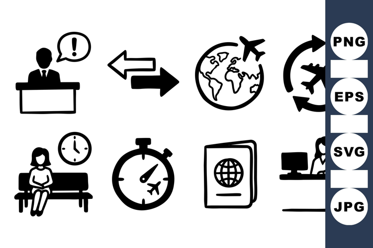 A collection of simple black vector icons depicting airplane travel including passenger waiting, stopwatch with plane, passport, and service desk, in casual sketch style.
