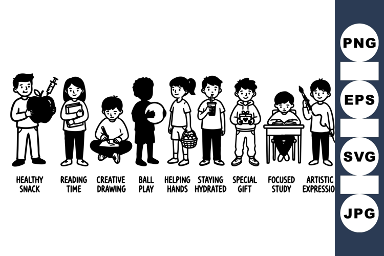 Monochrome vector art features children in educational and playful activities like helping hands, staying hydrated, special gift giving, focused study, and artistic expression in confident poses, offering a clear and simple visual style suitable for educational or childrens health themes
