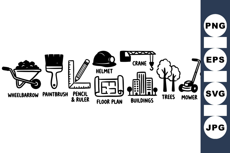 A minimalist hand drawn vector featuring construction and landscaping tools alongside building and nature icons, designed for editorial and print with a clean monochrome style.