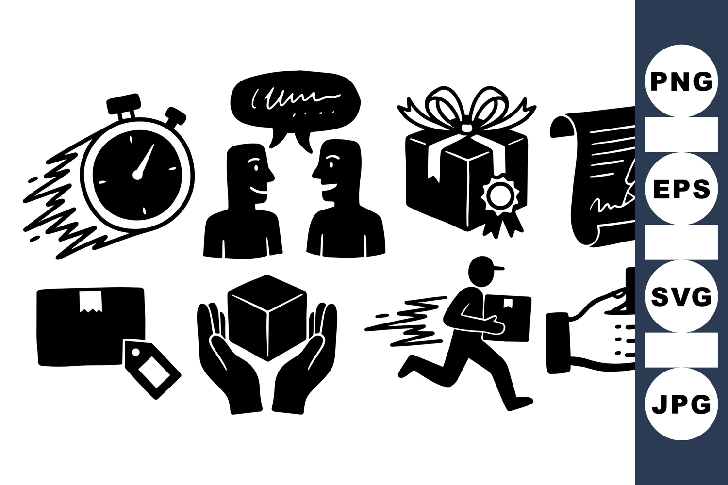 of black silhouette delivery icons featuring fast courier, stopwatch, gift box with ribbon, contract signing, and package handling in bold flat design style