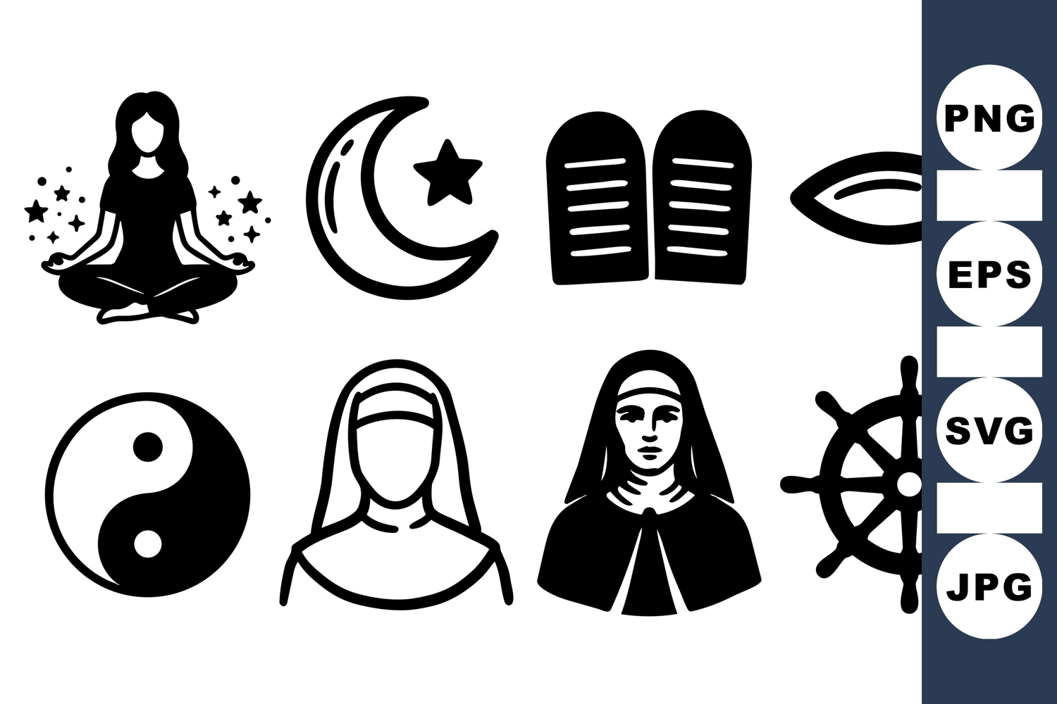 Spiritual Icon Nun Silhouette Holy Bible Clipart Christian Faith Graphics Religious Vector Pack Meditation Symbol Collection Buddhist Dharma Wheel Yin Yang Vector Design Faith And Peace Icons Sacred Symbol Illustrations