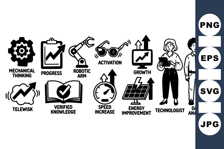 Black and white vector icons illustrate mechanical thinking, growth, and progress alongside technologist and data analyst characters in simple line art style, informative and clear.