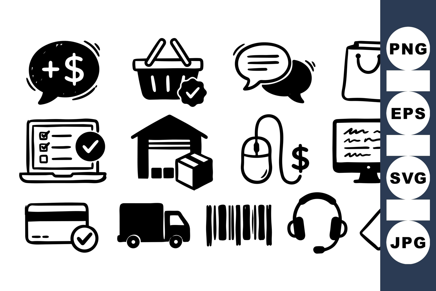 A collection of hand drawn ecommerce icons including shopping, delivery, payment, customer service, and inventory management with a sketchy style, versatile for web and print design.