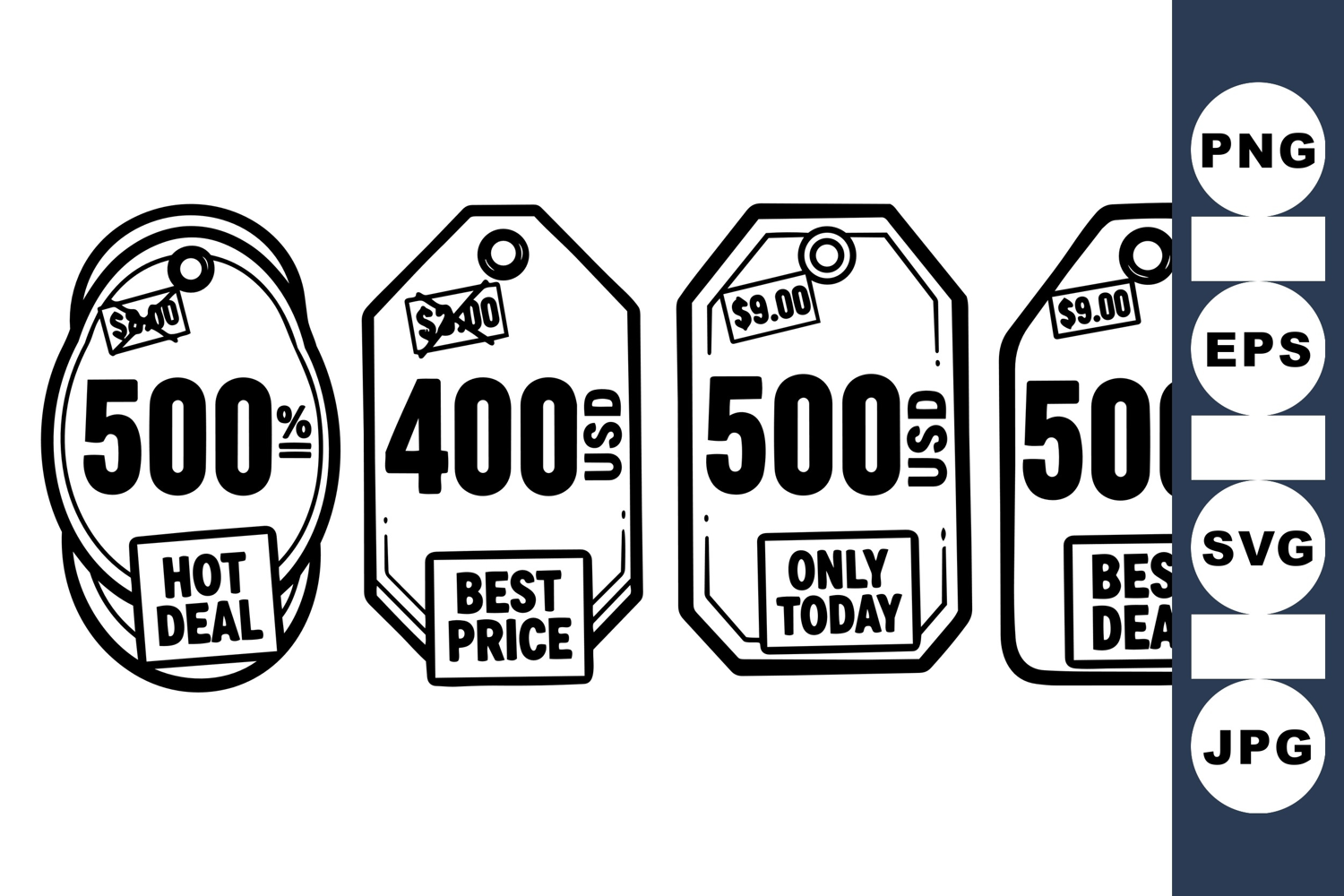 Four black and white discount tags display prices and sale messages in minimalist vector line art style, suitable for promotional and marketing materials, clean aesthetic.