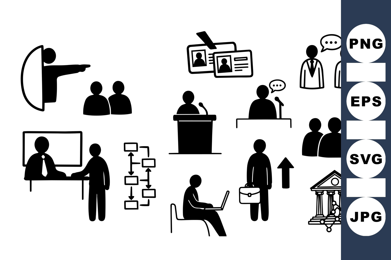 A collection of black silhouette business icons shows actions like negotiation, teamwork, laptop work, hierarchy, and legal structures connected to data, in minimalist vector style.