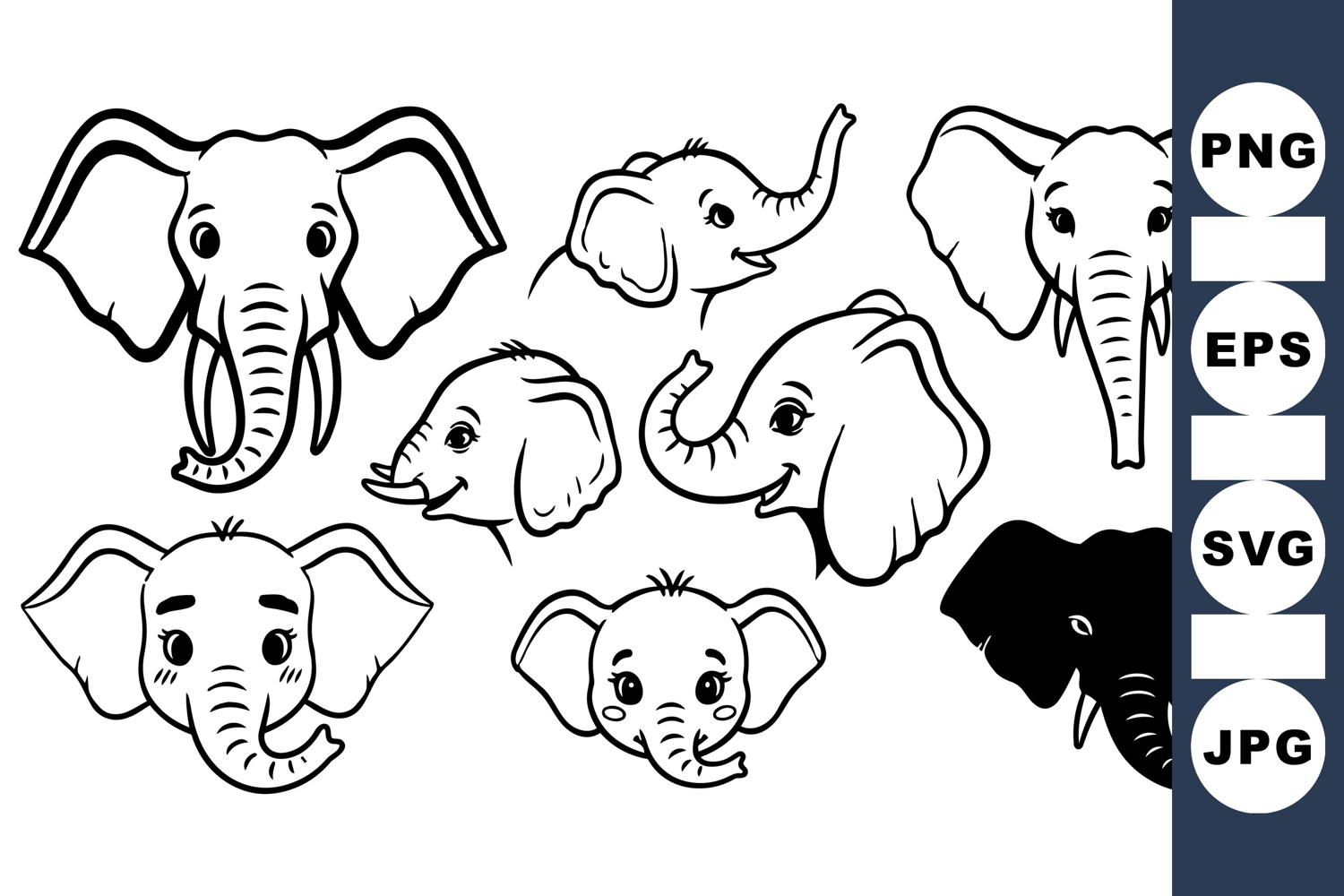 Animal Svg Black And White Clipart Baby Animal Clipart Cute Elephant Illustration Elephant Cartoon Elephant Line Art Wildlife Vector Animal Head Graphics Elephant Head Clipart Cartoon Animal Designs