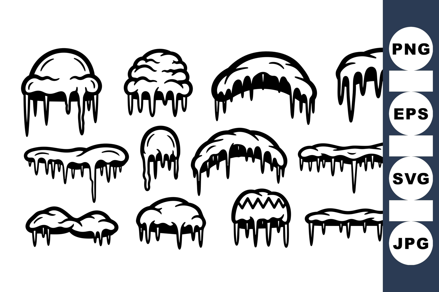 Collection of black and white vector icicles and snow caps in various shapes and sizes, perfect for winter themed designs and decorations, clean and bold graphic style.