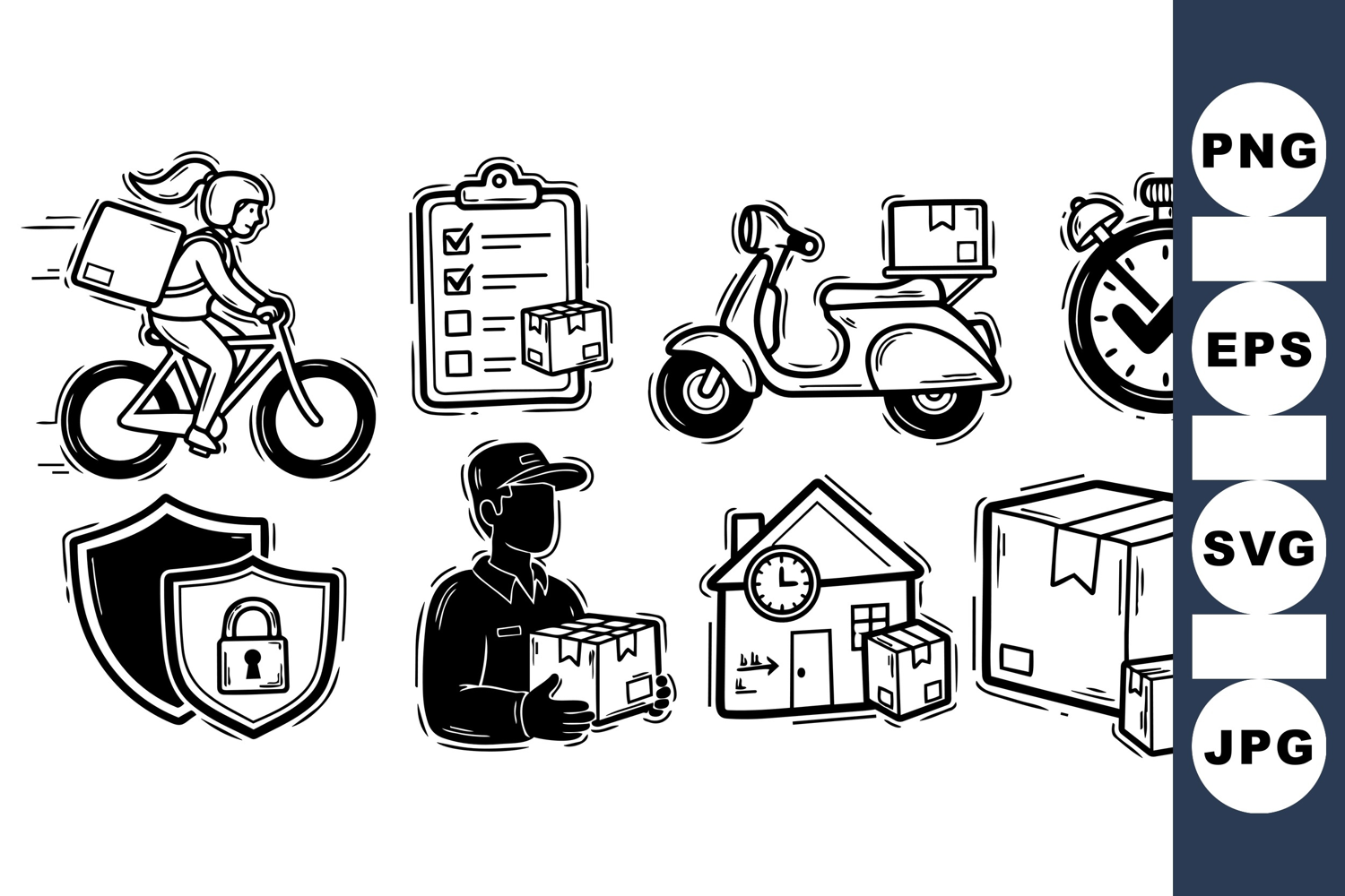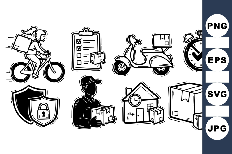 of black and white delivery themed vector icons including courier on bike and scooter, stopwatch, secure shields, checklist, and packages in line art style for branding and logistics design.