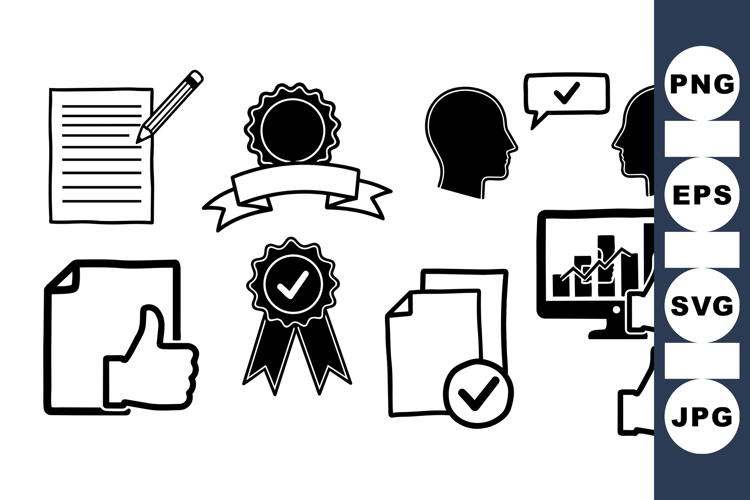 Minimalist black and white vector icons including checklist, approval ribbons, thumbs up, and communication silhouettes for clear business and team collaboration visuals.