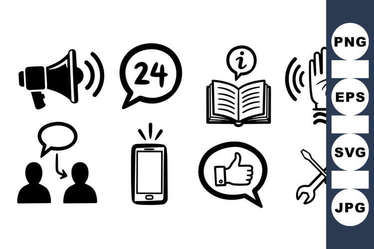 A collection of hand drawn line icons depicting communication and support themes including chat bubbles, phone, open book, hand signals, and tools for service and approval.