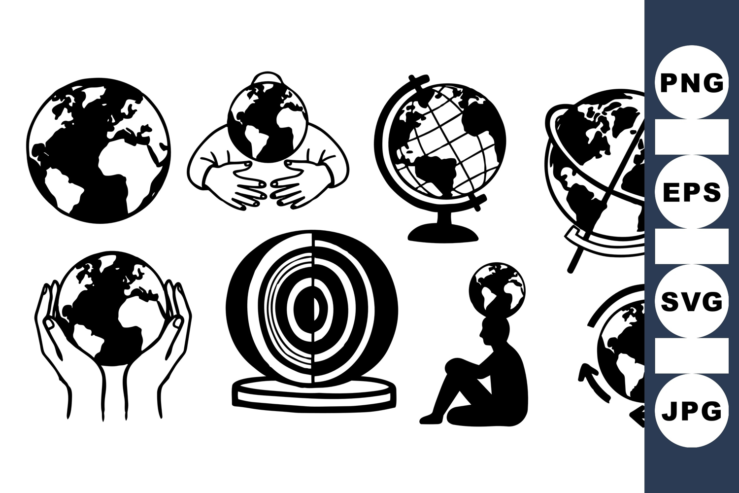 A of black silhouette vector designs featuring earth globes in hands, globe rotation, earth layers, and a person contemplating the planet, conveying global care and geology themes.