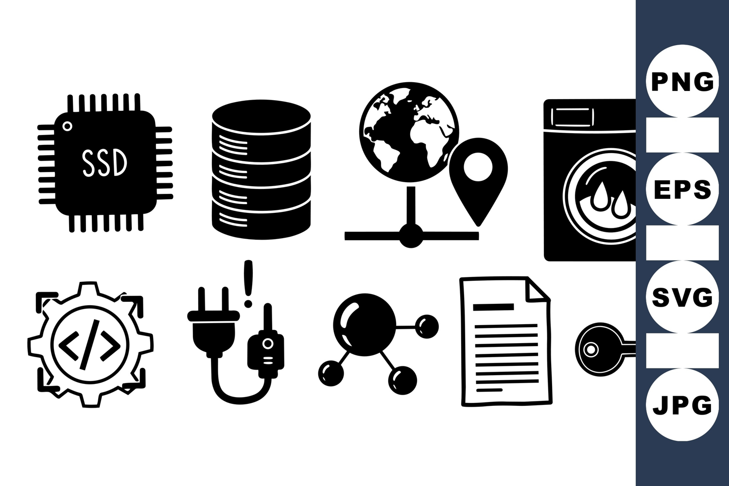 Solid black icons display common technology and utility symbols including ssd chip, database, coding gear, global network, washing machine, power plug, molecule, document, and key in minimalist style.