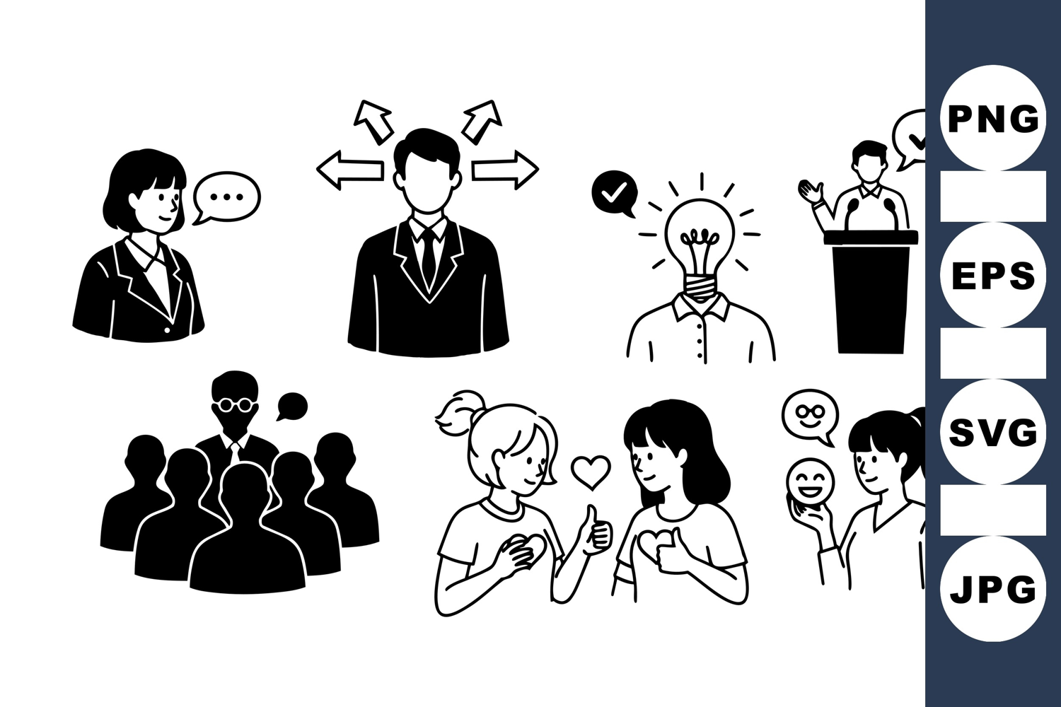 Business Meeting Business Communication Icons Presentation Vector Pack Idea Lightbulb Icon Professional People Icons Public Speaking Graphics Team Discussion Symbols Chat Bubble Icons Communication Skills Clipart Group Conversation Icons
