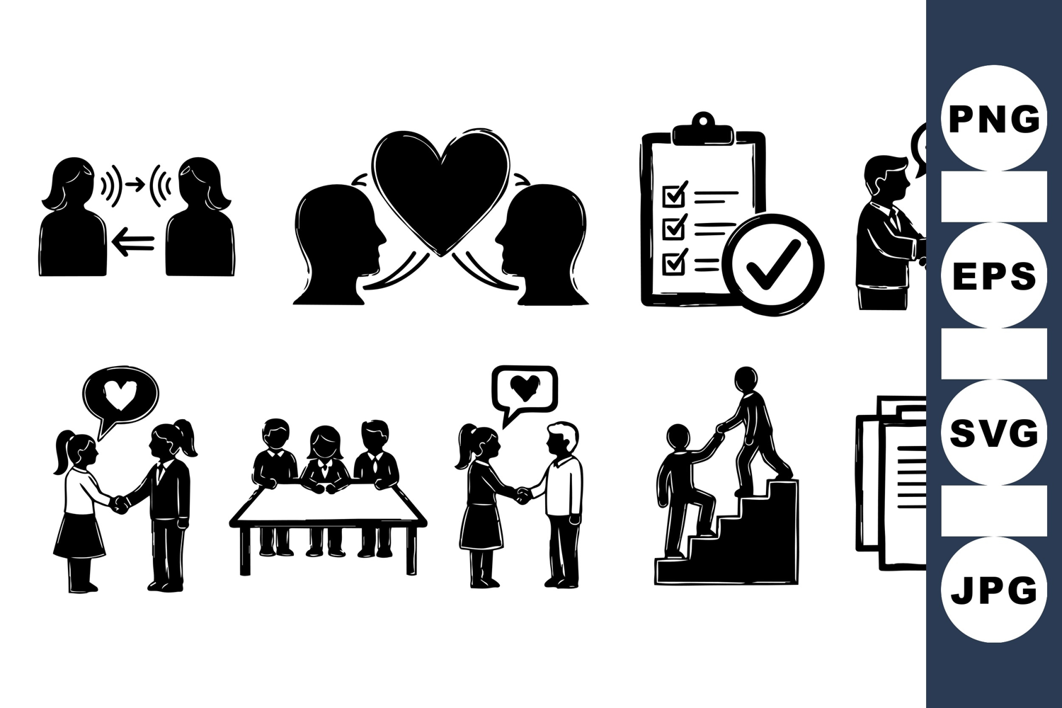 A series of black silhouette vector icons depicting communication, handshake with love, teamwork meetings, support climbing stairs, and document verification, conveying collaborative and professional themes in flat design style.