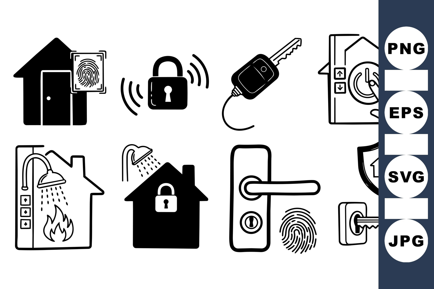 Digital Lock Smart Home Icons Security System Graphics Fire Safety Illustrations Home Lock Vectors Fingerprint Sensor Icons Wireless Alarm Smart Door Handle House Protection Graphics Keyless Entry Icons