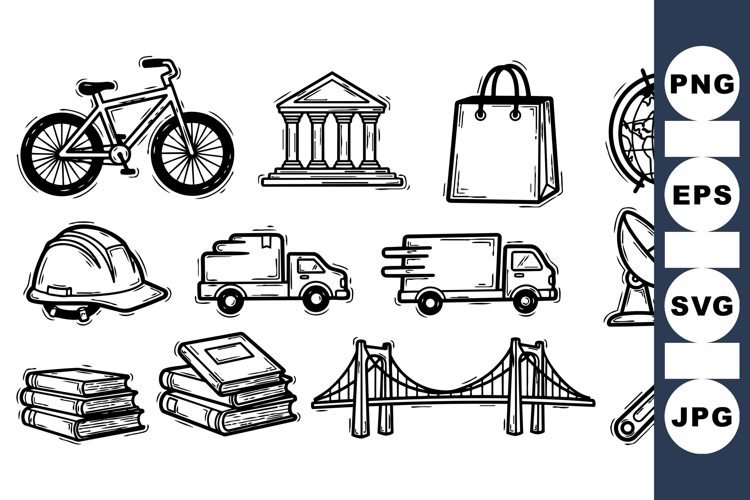 Hand Drawn Icons Cityscape Clipart Urban Transport Vector Delivery Truck Graphics Construction Safety Icons Satellite Dish Illustration Bridge Hand Drawing Library Book Icon Cycling Urban Clipart Modern City Artwork