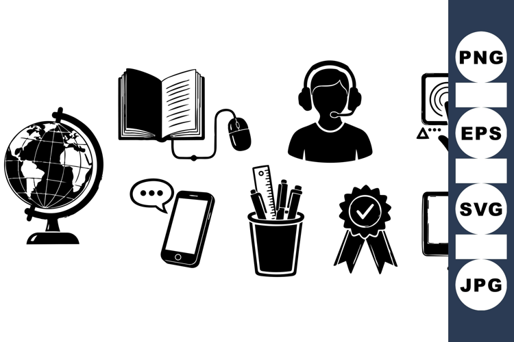Simple black and white educational vector icons include globe, book with mouse, head operator, smartphone chat, pens in cup, award, and computer checklist in flat design style.
