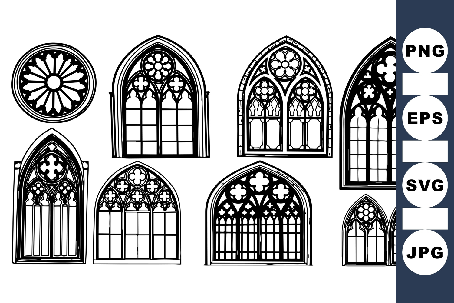 Collection of detailed gothic style stained glass windows in black and white vector art showcasing varied arch shapes and tracery for architectural design projects