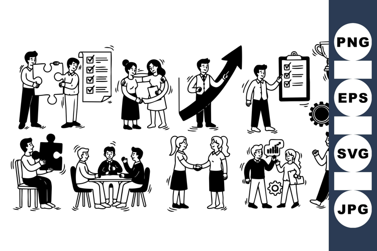 A monochrome vector depicts various business teamwork activities including collaboration with puzzle pieces, handshake, presentations, and success celebration in simple line art style.