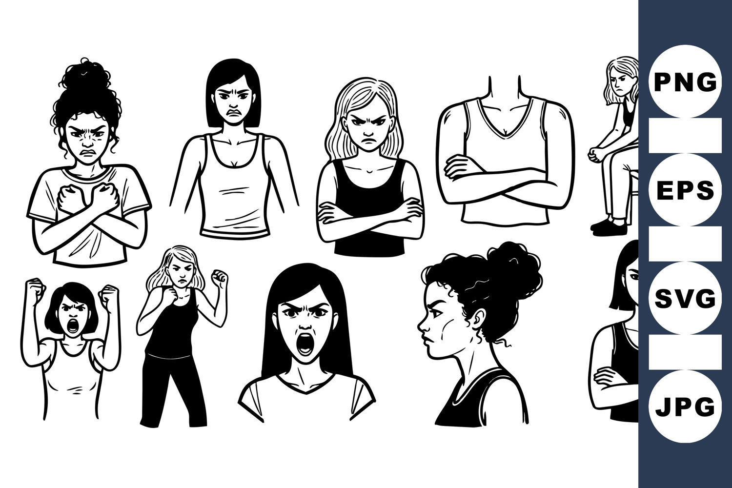 Line art vector featuring angry women with crossed arms, clenched fists, and grim facial expressions showing intense emotions and body language in black and white.