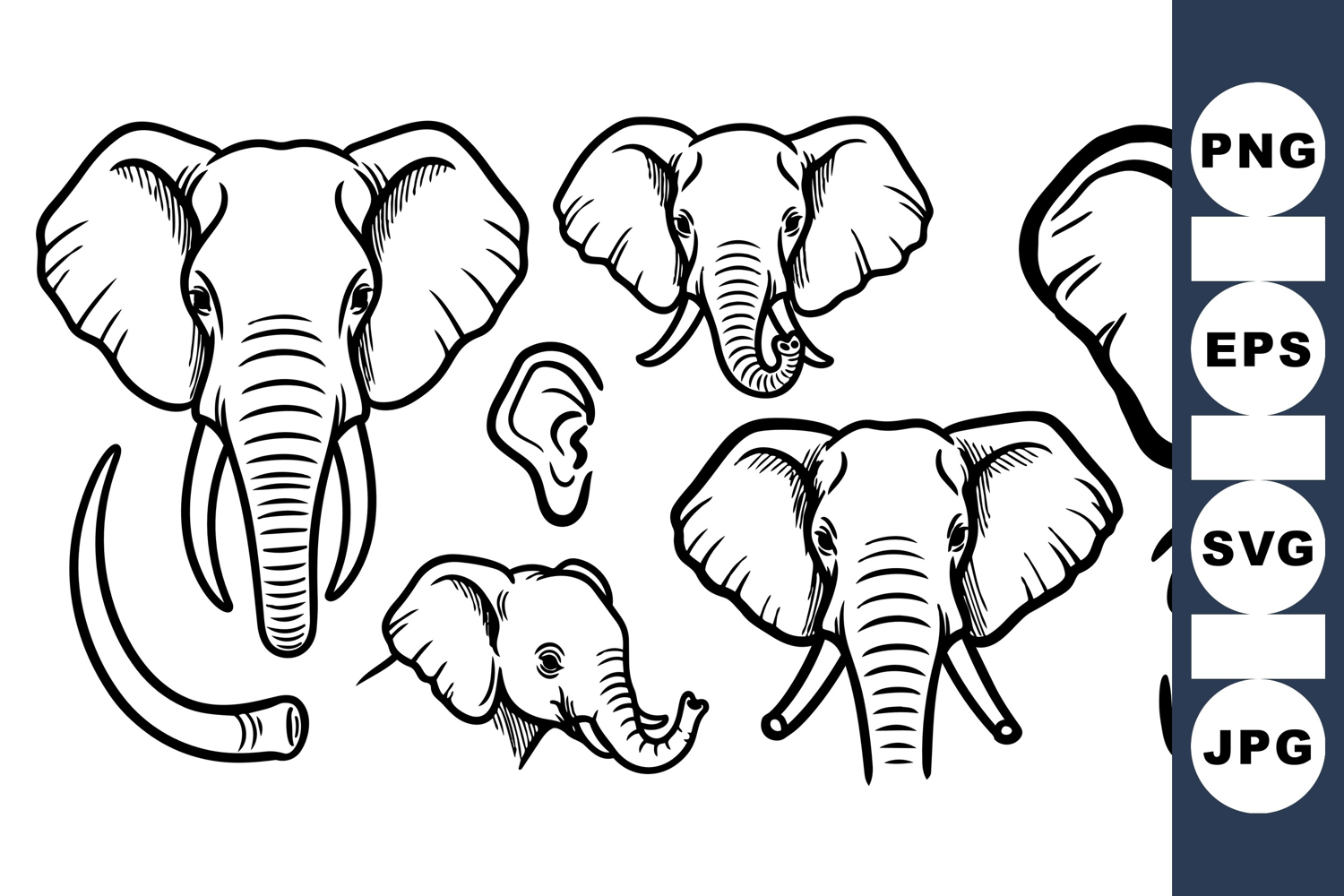 Detailed hand drawn black and white vector sketches of elephant heads, ears, and tusks perfect for educational or wildlife themed designs.