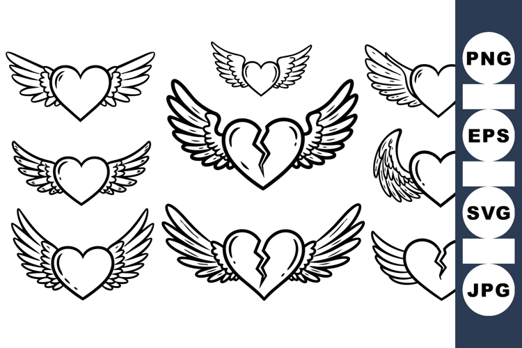 Outline vector collection displaying hearts with wings, including broken and complete styles, created in flat black line art perfect for tattoo and emblem design.