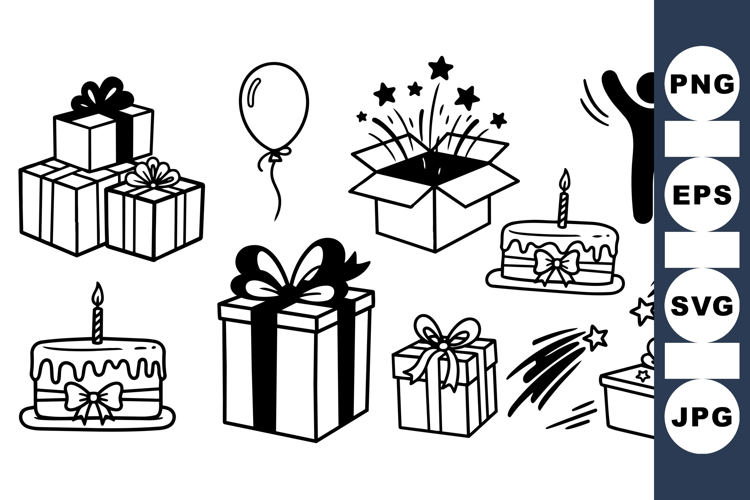 Black and white vector icons feature birthday cakes, gift boxes, balloons, fireworks, and a celebrating person in outline style for party and celebration themes.