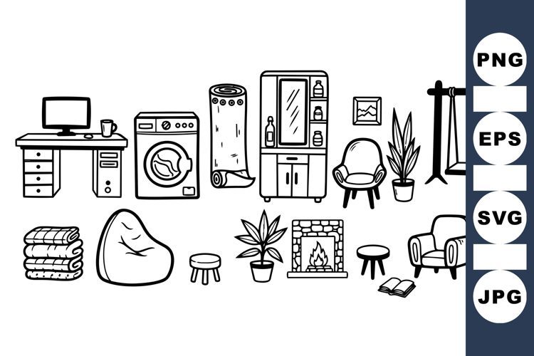Simple black outline illustrations depict various home furniture and appliances such as a computer desk, washing machine, fireplace, and swing in minimalist style.