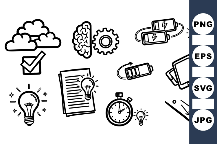 A collection of black line art icons depicting cloud with checkmark, brain with gear, batteries, tablets, light bulbs, and stopwatch for creative concept designs.