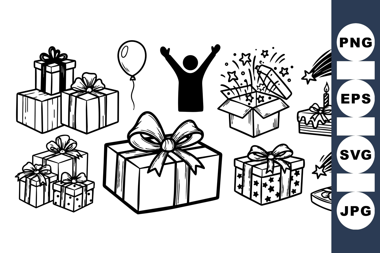 Black and white hand drawn vector collection of gift boxes, balloons, a celebrating figure, and shooting stars illustrating festive celebration mood and joy.