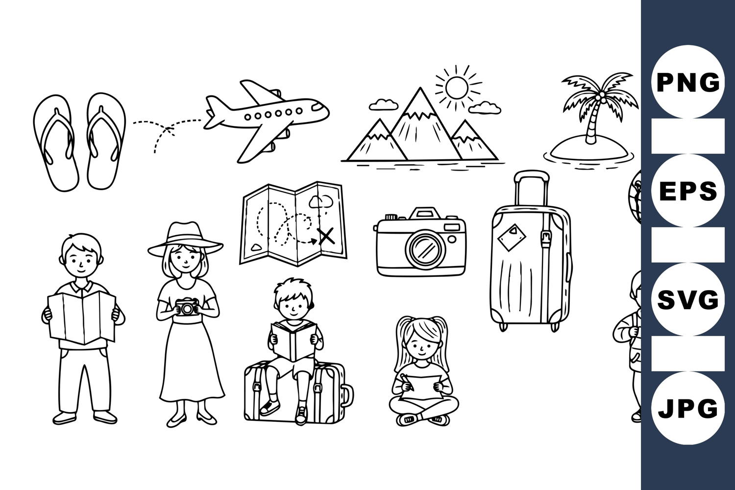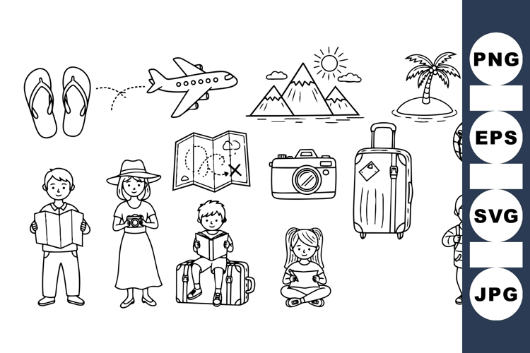 Hand drawn black and white line art depicts children traveling with suitcases, maps, and cameras along with travel icons such as mountains, globe, plane, and palm tree