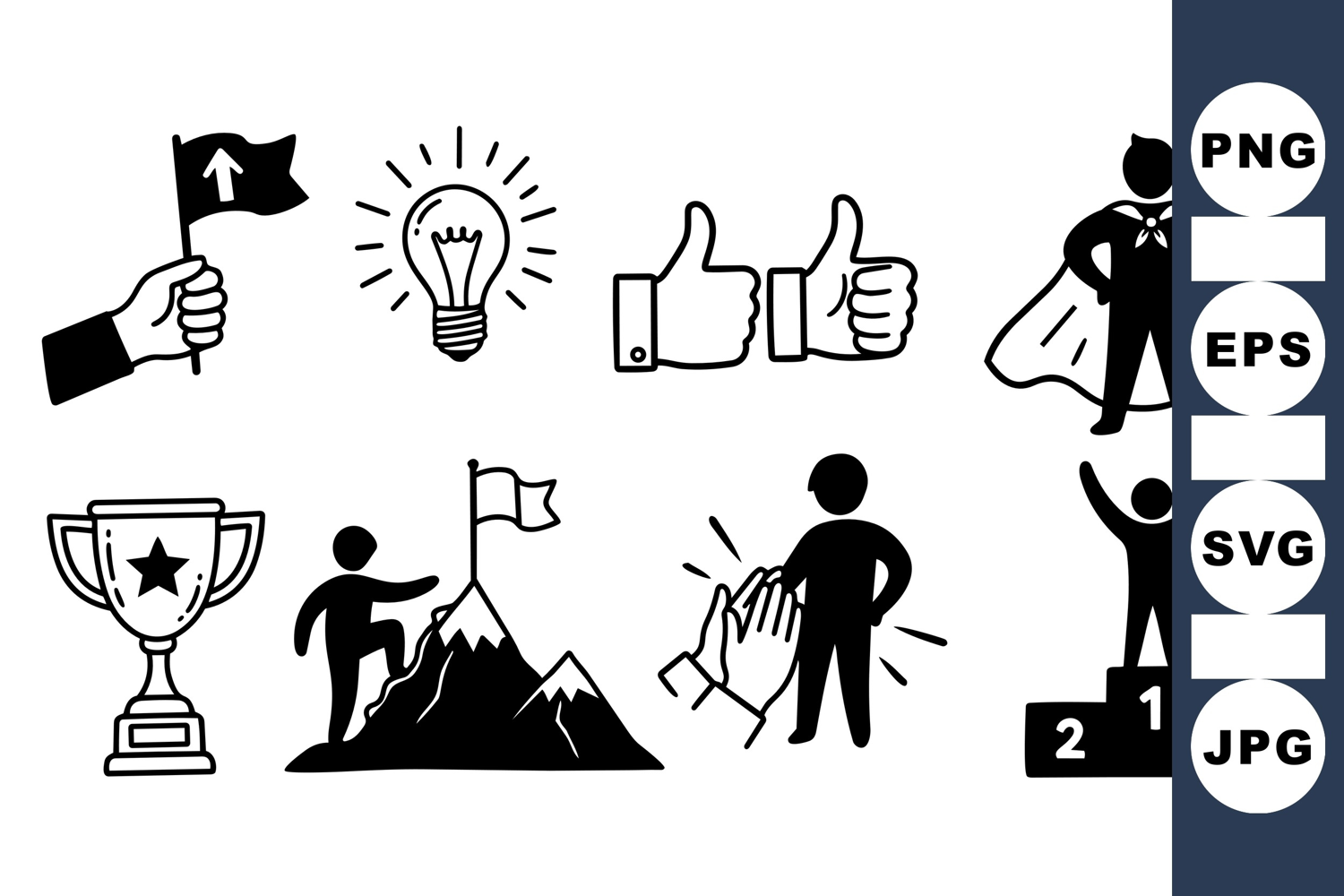 of black and white vector icons depicting achievements and success such as a hand holding flag, light bulb, thumbs up, superhero, trophy, mountain climber, applause, and podium.