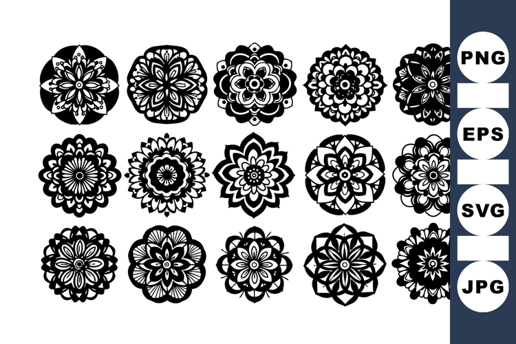 Collection of black and white floral mandala icons featuring symmetrical, intricate circular patterns ideal for design, decoration, and artistic projects.