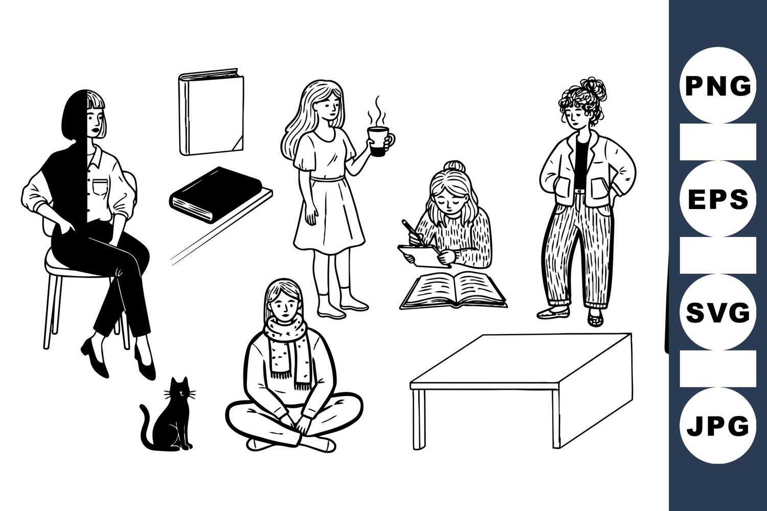 Black and white vector line art shows diverse young women reading, writing, sitting cross legged, holding coffee, and standing near books and a cat with casual vibes.