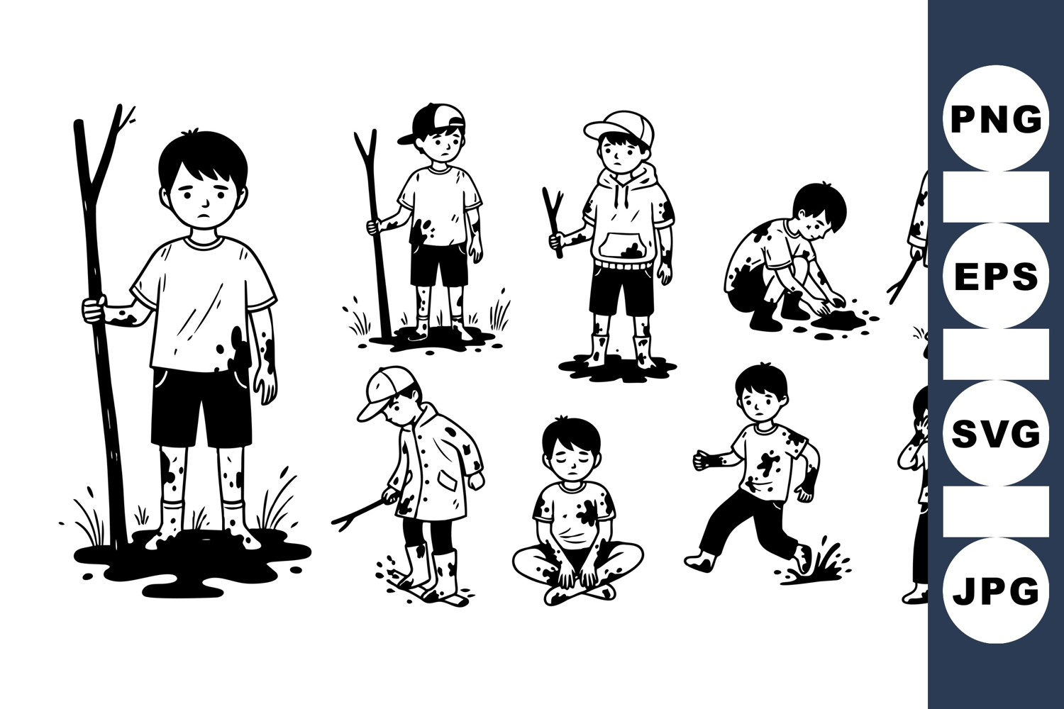 Black And White Kids Messy Play Outdoor Activity Illustration Children Playing Vector Muddy Kids Clipart Fun Messy Artwork Stick Playing Graphics Boy Character Design Mud Puddle Vector Active Children Clipart