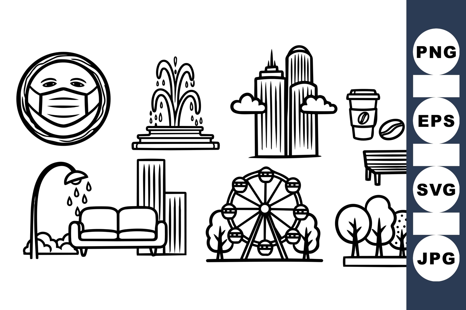 A collection of simple black line art icons featuring a masked face, city fountains, buildings, coffee elements, park seating, ferris wheel, and urban trees for versatile design use.