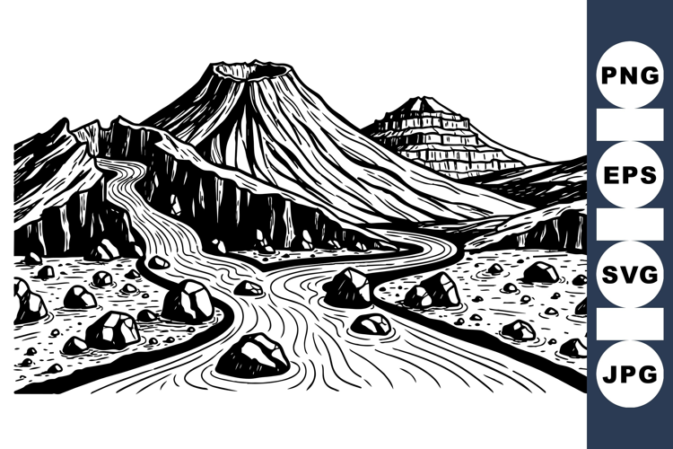 Monochrome vector artwork portrays a winding river in volcanic mountains surrounded by rocky terrain and a flat plateau, rendered in bold graphic style, peaceful