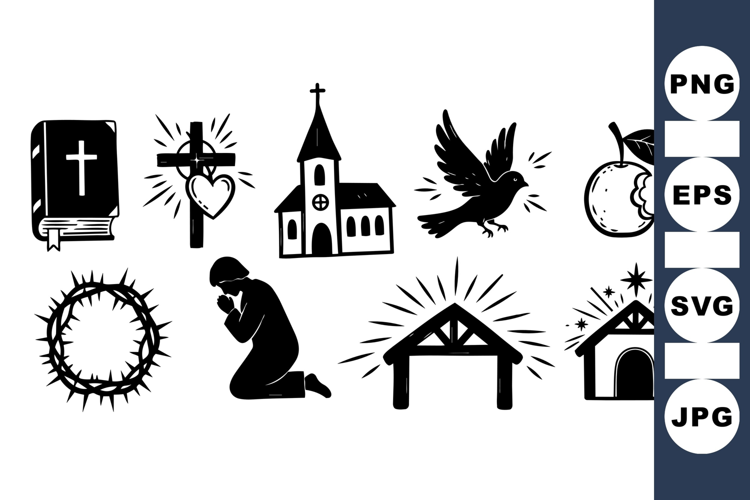 Black silhouette vector icons depict christian symbols including praying man, church, cross with heart, dove, bitten apple, crown of thorns, and nativity stable with star, conveying religious themes in minimalist style.
