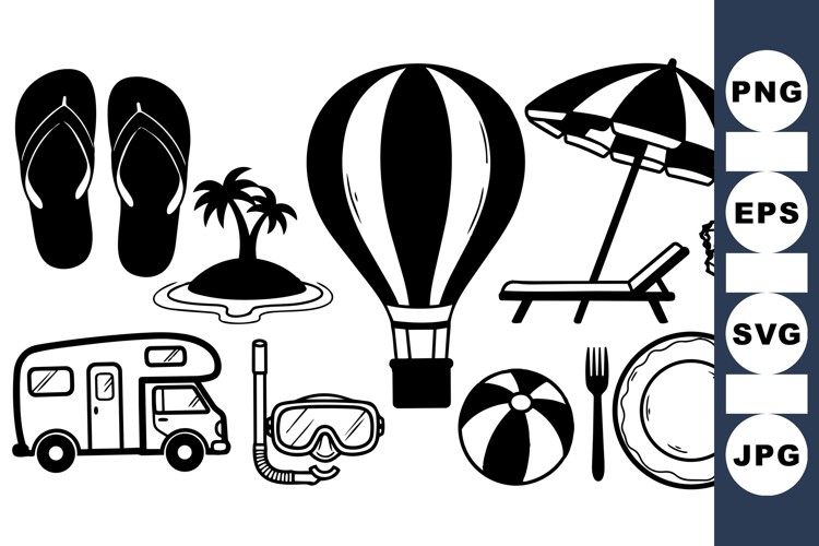 A collection of black and white vector icons illustrating summer travel essentials such as flip flops, hot air balloon, camper van, snorkel gear, beach ball, and tropical island silhouettes.