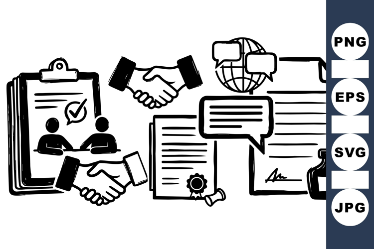 Black line art vector featuring handshake agreements, contract documents, speech bubbles with globe, and ink feather pen symbolizing communication and legal partnership.