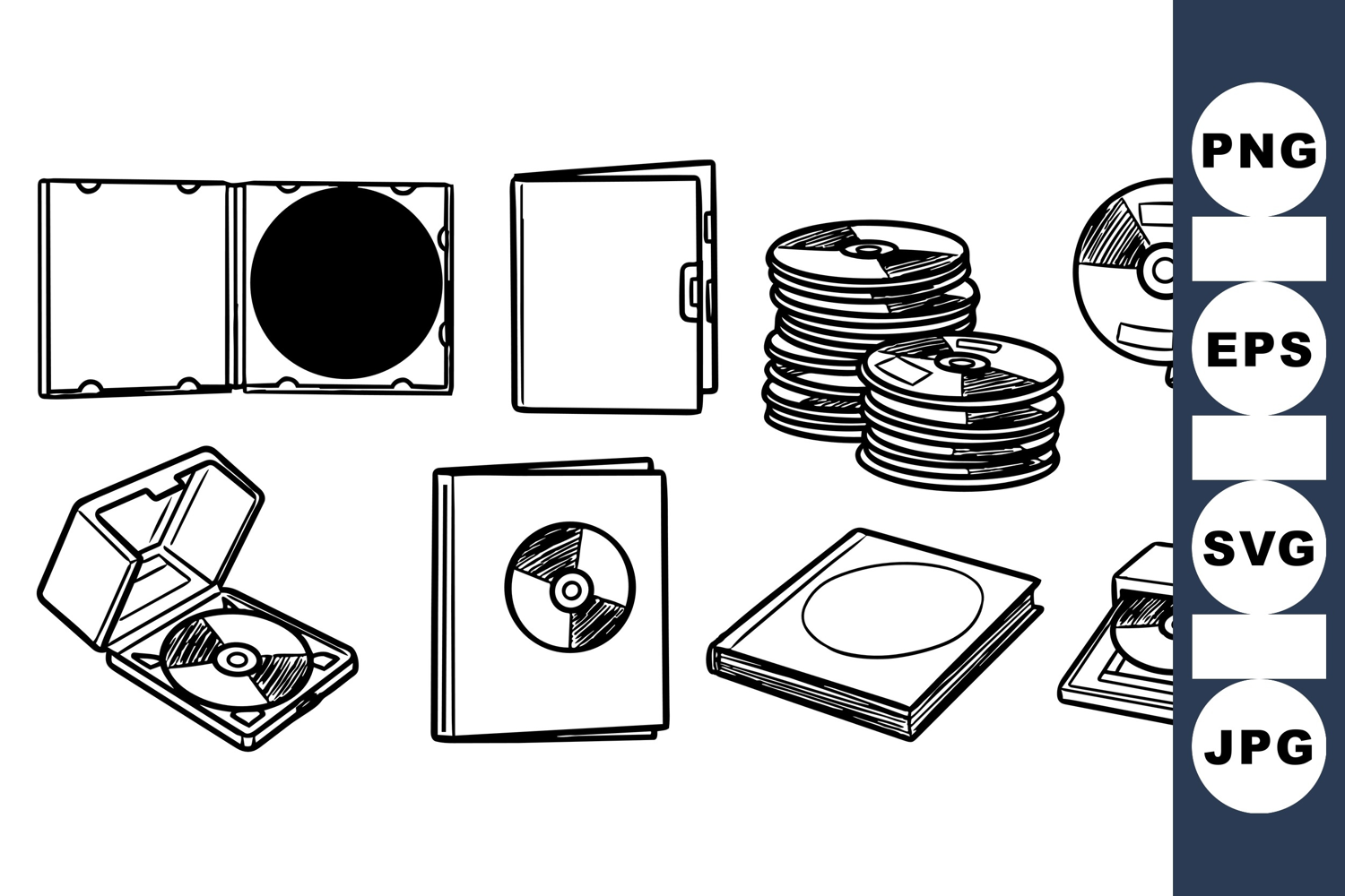 A collection of black and white line drawings featuring stacks of cds, open and closed cases, and a hand holding a compact disc from various viewpoints, simple minimalist style.
